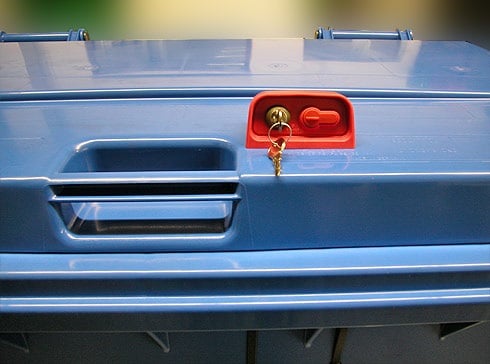2 og 4 hjulede affaldscontainere kan leveres med selvoplukkelig lås som ekstraudstyr.