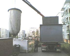 Tømningen af beholderne sker ved hjælp af en kranlastbil. Løftekrogen monteres på beholderen, og når sækken er over lastbilen, åbner man manuelt sækken, der derved tømmes