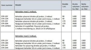 • Netto volume ca 1000 – 3400 liter • Brutto volume ca 1400 – 3600 liter • Bredde 90 eller 170 cm • Kan stå på jorden eller nedgraves ca. 50 cm • Handikapvenlig indkasthøjde 90 cm • Findes også til madaffald • Fås med forskellige indkast alt efter behov • Der kan tilvælges lås til lågerne